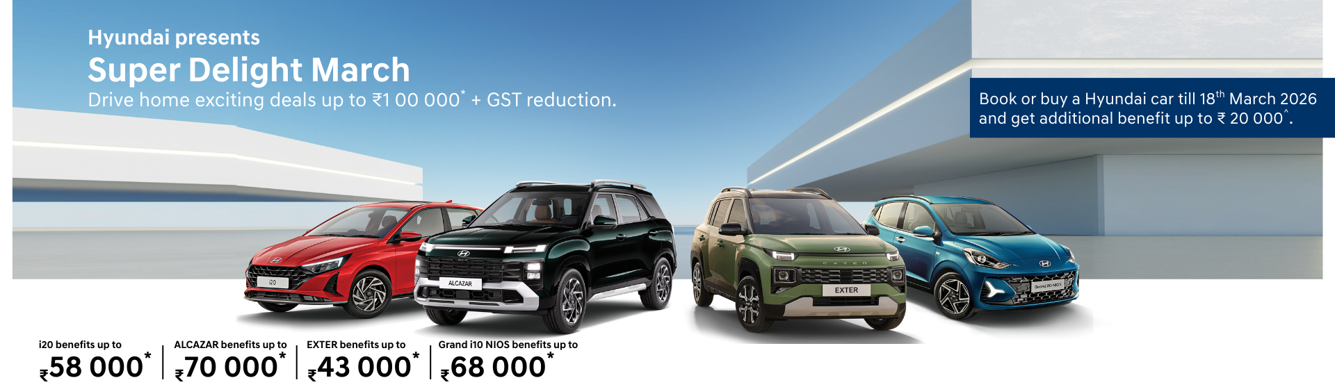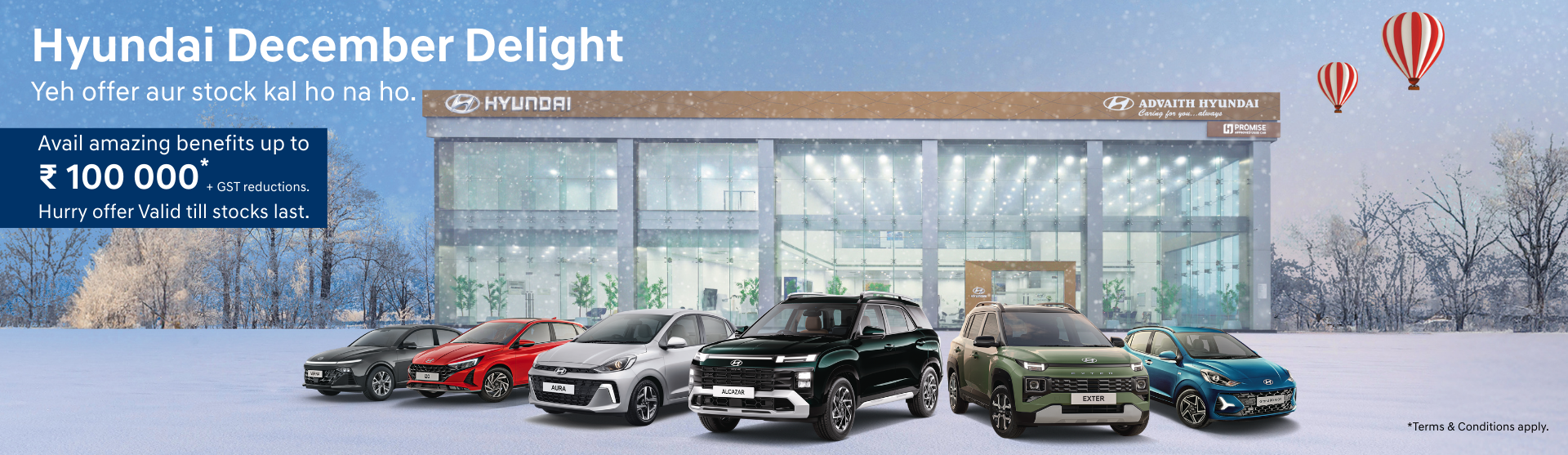 Find the best deals/offers on your dream Hyundai cars from World’s largest and most awarded Hyundai Dealer – Advaith Hyundai.Hyundai Offers / Discount includes Cash discount, Exchange offer, Corporate discount, and pride of India Offers, Hyundai Motor India / Advaith Hyundai reserves the right to change Offers / prices without prior notice.T&C Apply.